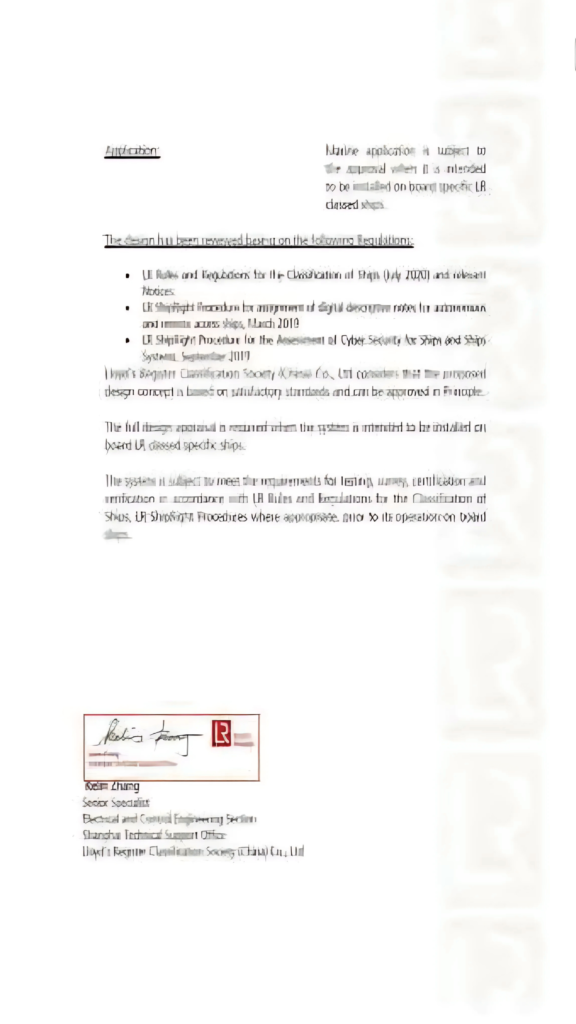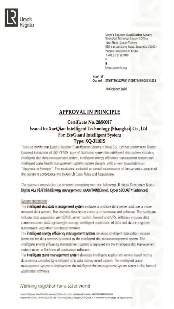 EcoGuard intelligent system is based o n LR digital descriptive notes: "Digital AL2 PERFORM (Energy management), MAINTAIN (Crane), Cyber SECURITY (Enhanced) ", has obtained AP certificate, and can apply for CCS, DNVGL, NK, ABS, BV, RINA and other major classification societies related certification to meet a wide range of needs including newbuildings and ships i n operation.